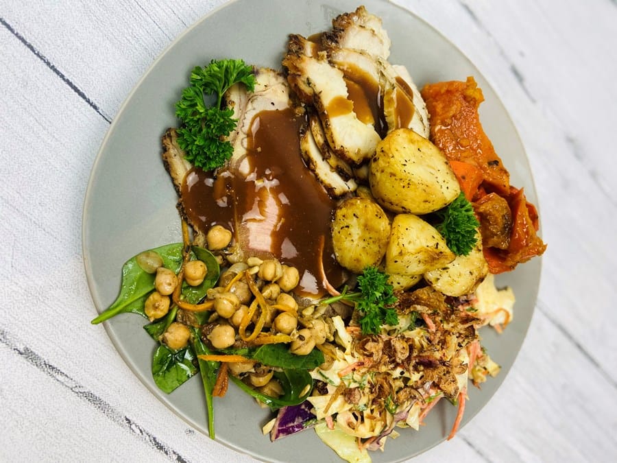 A joyful Christmas feast — tender turkey, slow-cooked beef, creamy potatoes, vibrant salads, and sweet festive desserts. Whether shared at the table or enjoyed from your own box, each bite feels comforting, generous, and full of holiday warmth.